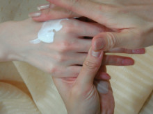 次に手の保湿です。クリームを甲に塗り、手指をマッサージします