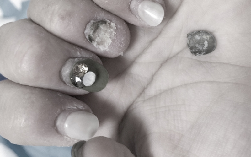 人工爪のケア・修理をします。 ※人工爪の浮きがある部分を削りアクリルで補充します。元の美しい形にお直しするコースです。 |